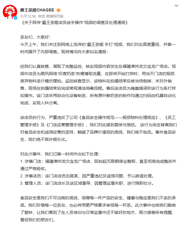 从劣势来看,霸王茶姬的舆情措置精准把握了舆情措置的“时”取“度”,踩中了环节响应节点。按照舆情措置“时、度、效”焦点准绳,涉及好处的严沉突发事务舆情,最迟需正在5小时内发布权势巨子消息。霸王茶姬正在上午监测到舆情后,下战书便发布细致传递,全程未跨越4小时,无效避免了负面消息的进一步扩散。传递内容也做到了“现实清晰、义务明白”:通过调取核实事务地址、缘由及物料去向,明白“未对外发卖”的焦点争议点,同时将义务精准归罪于涉事伙计违规操做和办理层监视失职,未呈现推诿塞责的表述。这种“不偏护、不淡化”的立场,以及自动强调“门店常规制茶为从动化设备、人料分手”的弥补申明,试图切割个体违规行为取品牌全体的联系关系,合适舆情措置中“精准切割风险、避免负面扩散”的焦点逻辑。