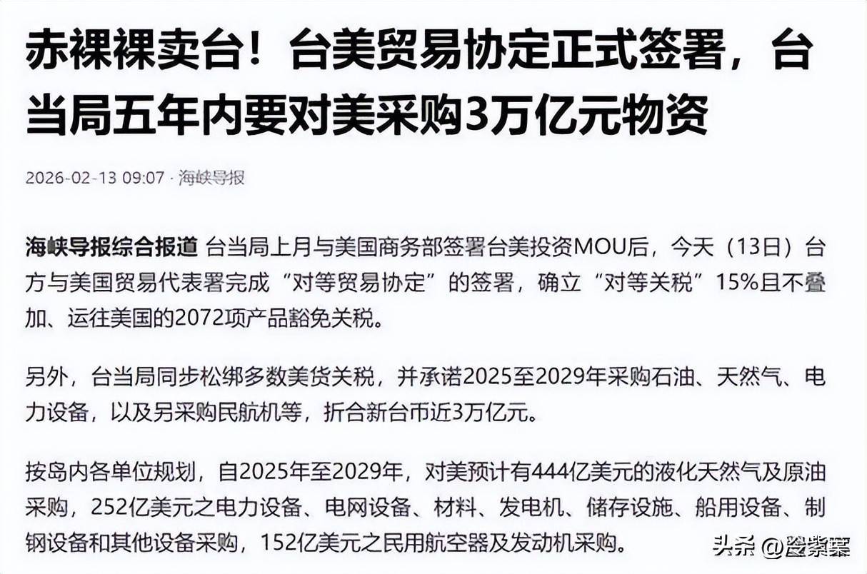 就正在时间2026年2月13日,台悄然和美朴直式签订了那份备受争议的所谓“对等商业协定”。说到底,这份协定的焦点,正在2025到2029这五年里,要从美国多量量采购各类物资,算下来差不多是新台币3万亿元,换成美元大要850亿,采购的范畴也很广,电力设备、平易近用航空等多个环节范畴。